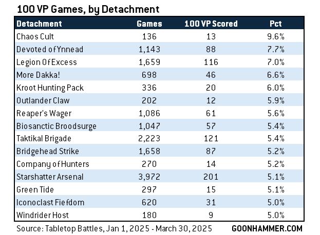 The range here - going from 2.4% to 4.9% - isn't huge, but it's enough to suggest some meaningful faction differences, since Genestealer Cults are more than 2x more likely to score 100 VP in a game than Grey Knights. Of course, we can further improve this by looking at Detachment, and because there are many more of those, we'll shorten the list to just the top results:
