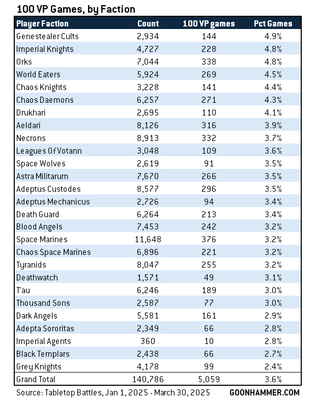 There are 5,059 games in our sample where a player scored 100 points. If we break those down by faction, we can look at which factions seem to be better or worse at landing 100-point games. Looking at the stats, here's what we see: