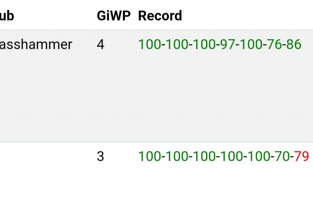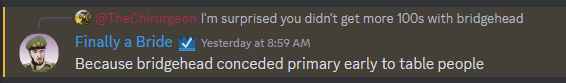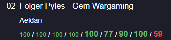 That's absolutely amazing, and something completely foreign to me as a player - in fact, going back over all of the games I've played in tenth edition, I've only scored 100 points ten times in 140 games played. I've never scored 100 points in more than one game at an event, and when I do it's usually in the first round or two when I'm most likely to be playing a weaker opponent. The concept of scoring five or more 100-point games at an event is just fully alien to me, to the point that I was a bit skeptical. So I did what I do in these situations and put it to the comp crew in our secret channel: Is this performance an insane outlier or something expected?