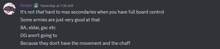 We already know (1) is true, and it makes intuitive sense, but now's a good time to dive into which Detachments that's true for and how we can identify them - Nassim mentioned his army trundling up the board as Combined Arms and I mentioned that when he played Bridgehead I didn't see him pulling 100s - something I'd have expected from a detachment as good at scoring secondary VP - and this was his response: