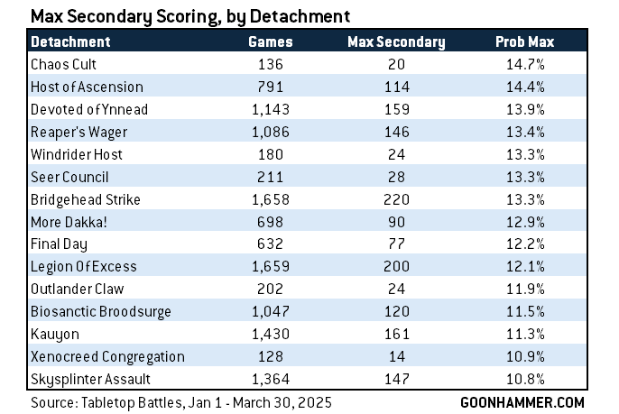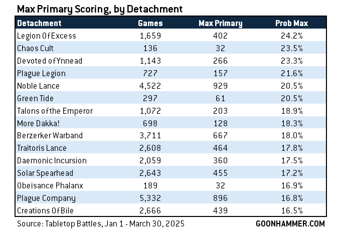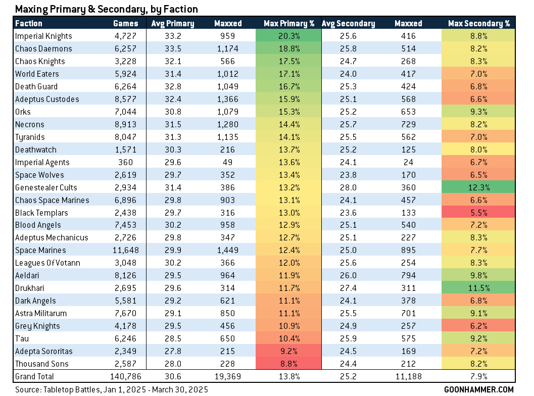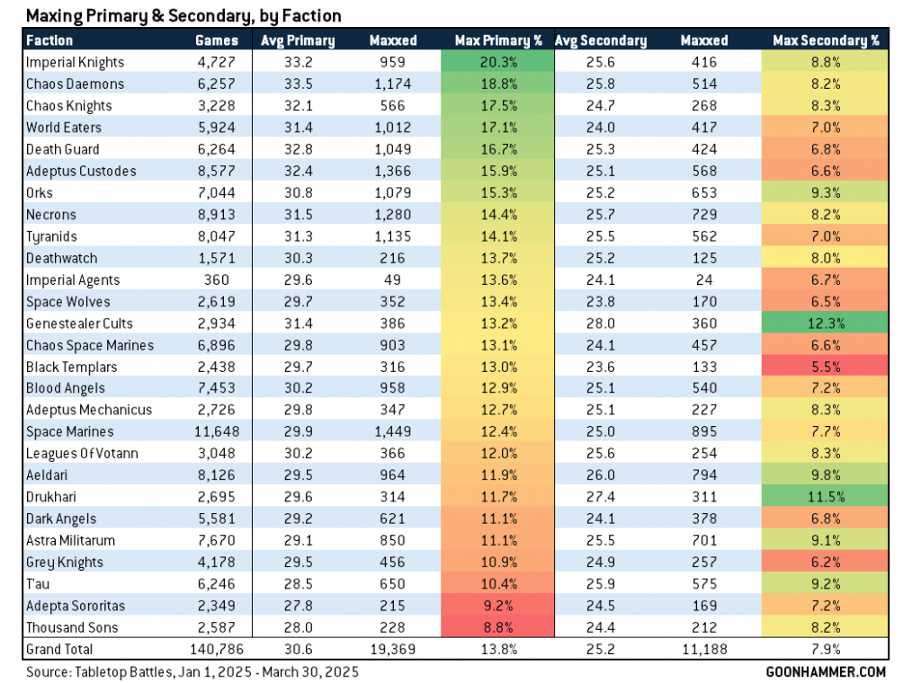 It's also fun to look at those averages and note that there's not a 1:1 correlation between higher average scores and likelihood of scoring max VP. They're definitely related, sure, but Genestealer Cults tend to have a higher average primary score and lower rate of scoring max primary than you'd expect.