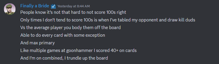 There's a secret Discord channel on the Goonhammer server where our best competitive players hang out. Also I'm in there, because I'm a server admin and they can't keep me out. It's where we have a lot of our discussions around top lists and builds, meta developments, and it's just generally a great place to bounce ideas off each other when it comes to creating competitive content.