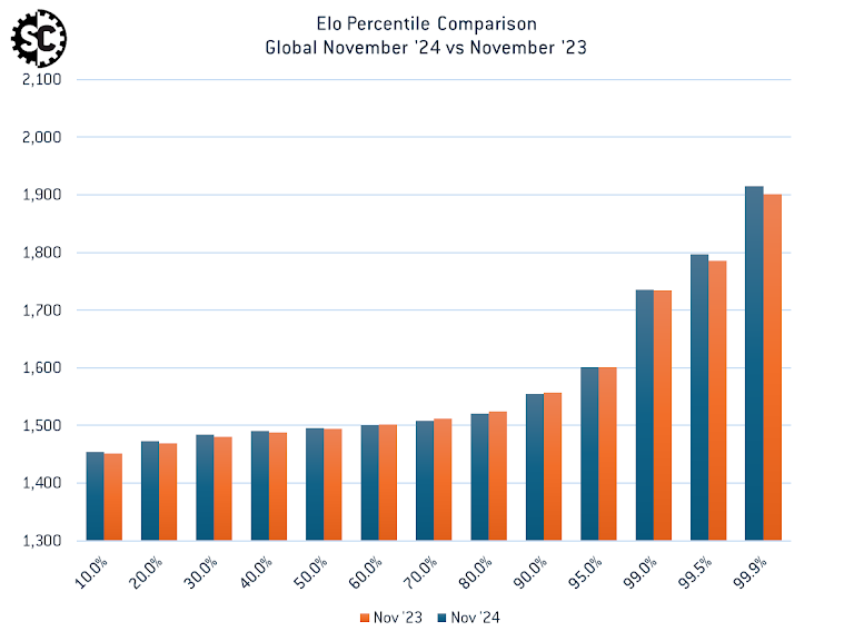 Before we look at the participants in WCoW ‘24, let’s quickly review what the current global Elo stats look like and how things have changed since this time last year. As a reminder, this dataset goes back to February of 2022 and now includes over 27,000 individual GT+ players and over half a million games.