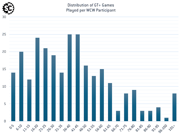 The data underscores that WCoW ‘24 features the highest concentration of top 100 players globally, surpassing even prestigious events like LVO and LGT. WCoW ‘23 had 49 out of the top 100 players with 175 players in attendance - all but guaranteeing that one of your games would be against one of these players. WCoW ‘24 keeps up this high representation, though the relative representation has slipped slightly, with 53 of the top 100 players present out of the 278 attendees.