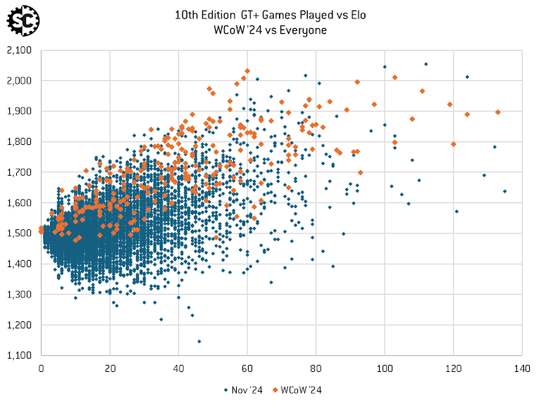 WCoW ‘24 attendees also play considerably more games than a typical player - see here for a comparison of GT+ games played vs Elo for the WCoW ‘24 attendees compared to the global player base for 10th Edition. The data comparison highlights a notable positive correlation (r=0.702) between games played and Elo ranking among WCoW ‘24 attendees, which is higher than the correlation observed in the global player base (r=0.541).