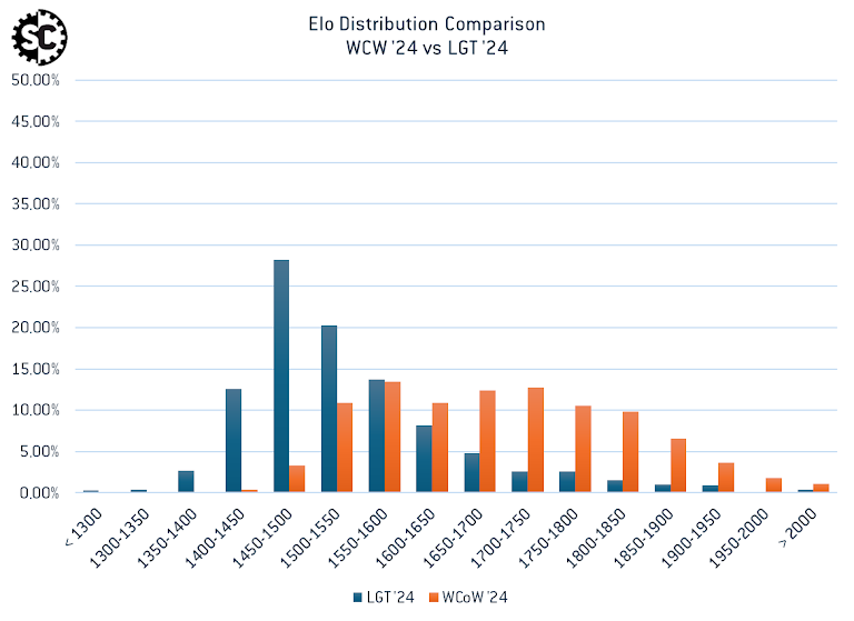 Keeping the WCoW ‘24 comparison in place, we can see a similar pattern with LGT ‘24 - though the 1450 to 1550 group is just above 50% for this event. This hints at a slightly more experienced player pool, something for another article it would seem!