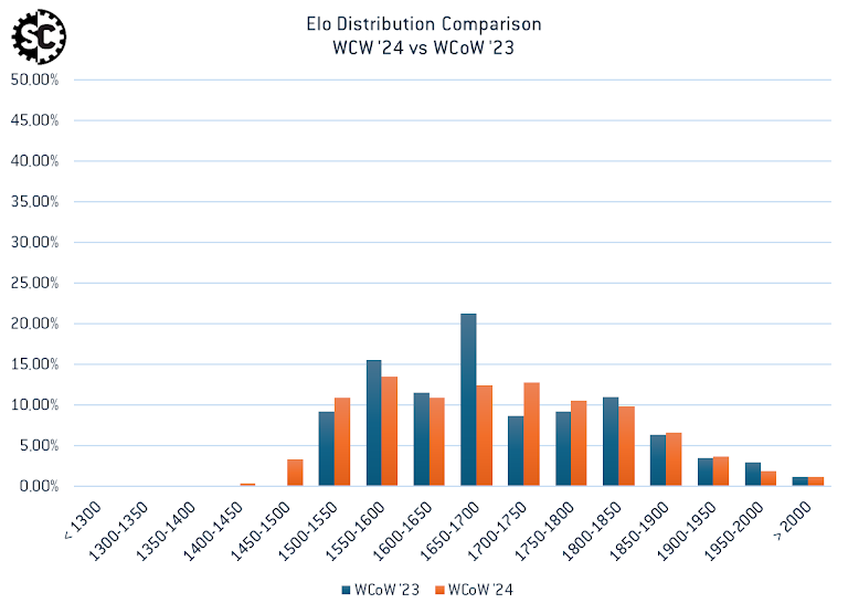 What’s interesting here is that WCoW ‘23 did not have a single player below 1500 going into the event, while there are a few present at WCoW ‘24. Some referred to WCoW ‘23 as the great Elo correction - you had a few players moving by 100 or more points (some up, some down!). It will be fascinating to look at how much of an impact on the standings this year’s event has, and how more (or less!) accurate the system is at predicting the outcome.