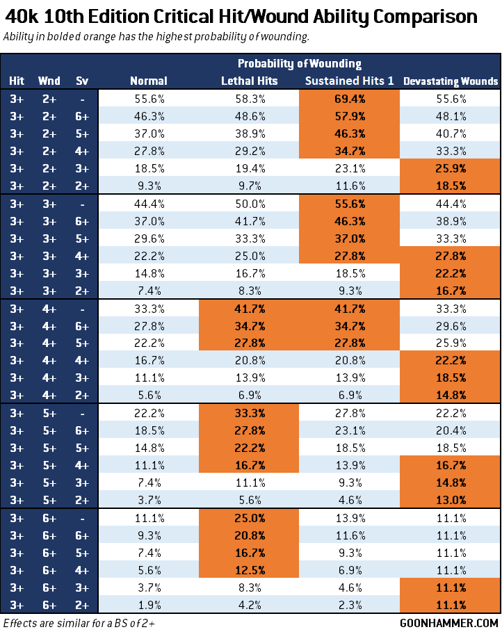 Rob: The big thing to be aware of here is how you can shift these probabilities up or down using things like Magnus' aura (which gives +1 to hit and wound for PSYCHIC attacks), the Ensorcelled Infusion Stratagem (bolters become S5 PSYCHIC weapons), and the Twist of Fate Cabbalistic Ritual. That last one is particularly interesting, since when your opponent can't take a save, Devastating Wounds becomes meaningless - Sustained Hits is the play at that point because every wound may as well be a mortal wound - the only difference is if you need spillover.