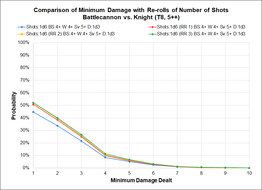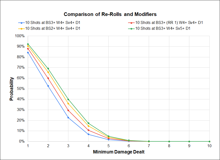 The presence of any re-roll at all does significantly influence the probability of doing damage, and as expected re-rolling results of 3 or worse on a d6 provides the greatest benefit. Compared to the benefit of having any reroll at all the improvement between re-rolling 1s, 2s, or 3s is relatively minor.