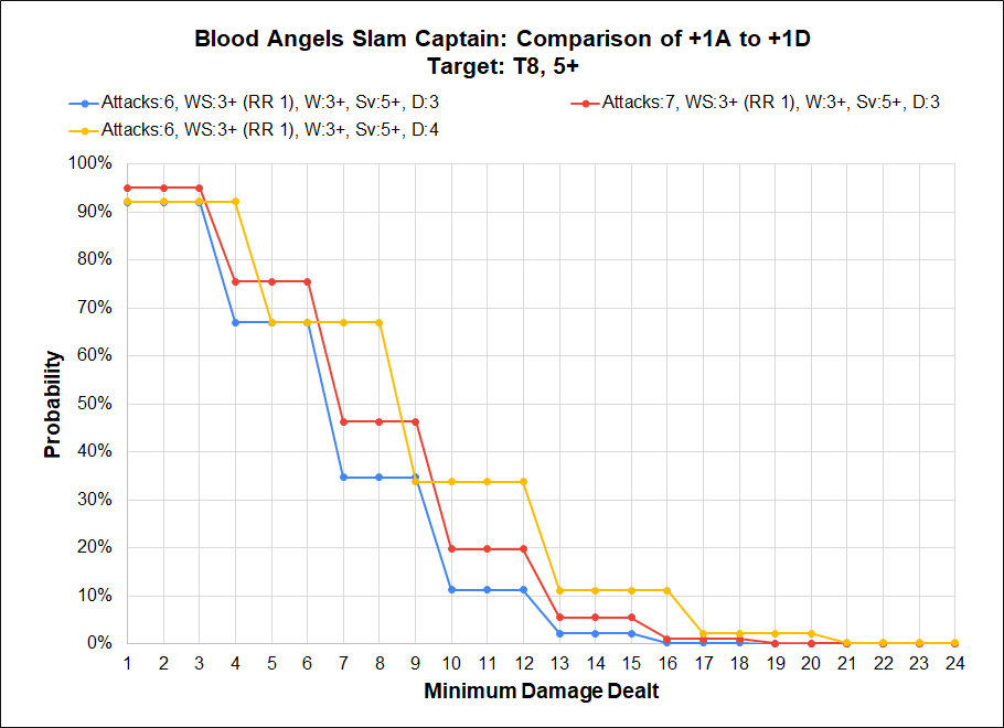 The blue line is once again our baseline Primaris rapid firing on Heretic Astartes; 10 shots hitting on a 3+, wounding on a 4+, and the target getting a 4+ save. We compare the influence of a Primaris Captain aura (re-roll 1s), getting a +1 to hit, and improving the AP by -1 through the tactical doctrine. The reduction in AP provides the greatest increase in probability, followed by the improvement to BS, and then finally the re-roll.