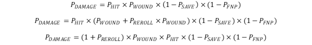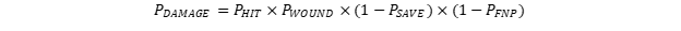 In order for an attack to succeed, those four rolls have to go the player’s way. It’s important to understand that because these rolls are independent their order does not matter for the purposes of determining probabilities. The outcome of the hit roll, for example, does not affect the outcome of the wound roll in any way. Outside of special rules like the Primaris Infiltrator’s Marksman bolt carbine automatically wounding on a hit roll of 6, there is no interference between the events. The probability equation for this is below: