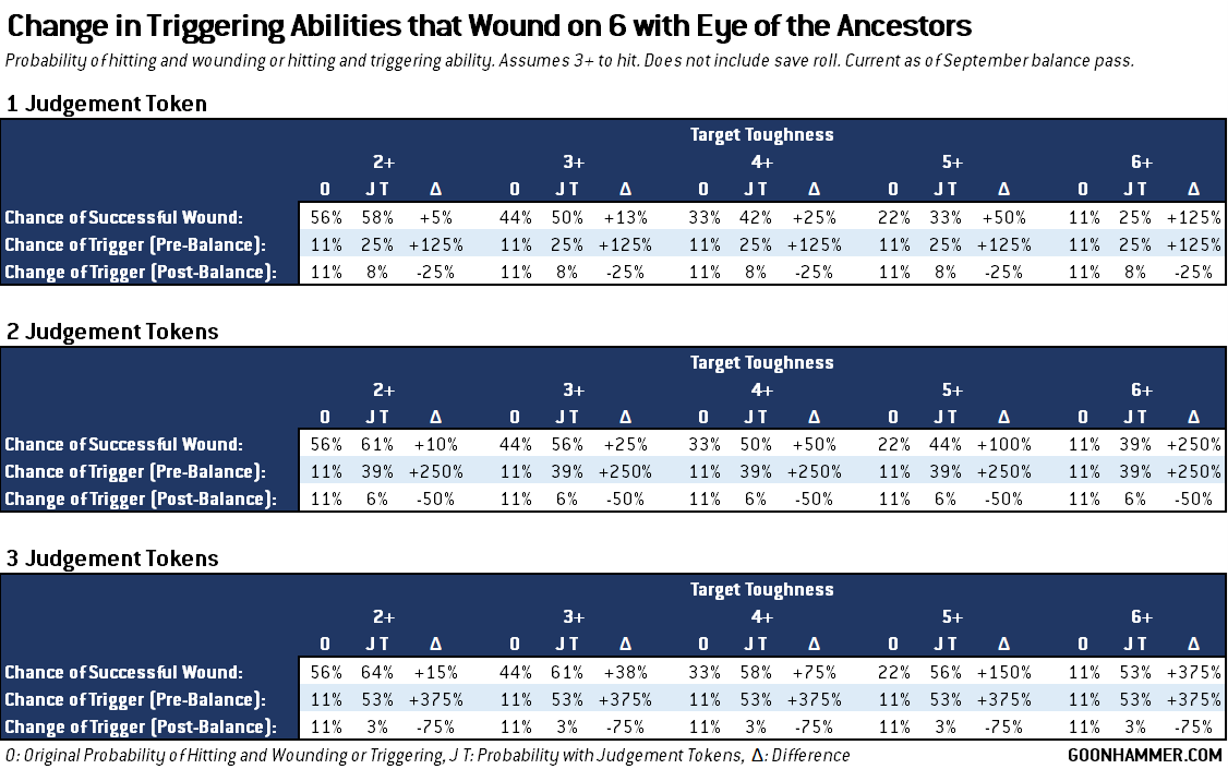One thing that interested us at Goonhammer was what would happen if the various effects triggered on an unmodified hit roll of 6 instead of an unmodified wound roll of 6. In this case the probability of triggering with at least one Judgement token would be a flat 17%, as the unmodified hit roll of 6 would also guarantee a wound. This is slightly higher than the 11% baseline probability achieved from a 3+ to hit and a 6 to wound, but is significantly less than the chances of triggering before the balance pass. If something like this was implemented then