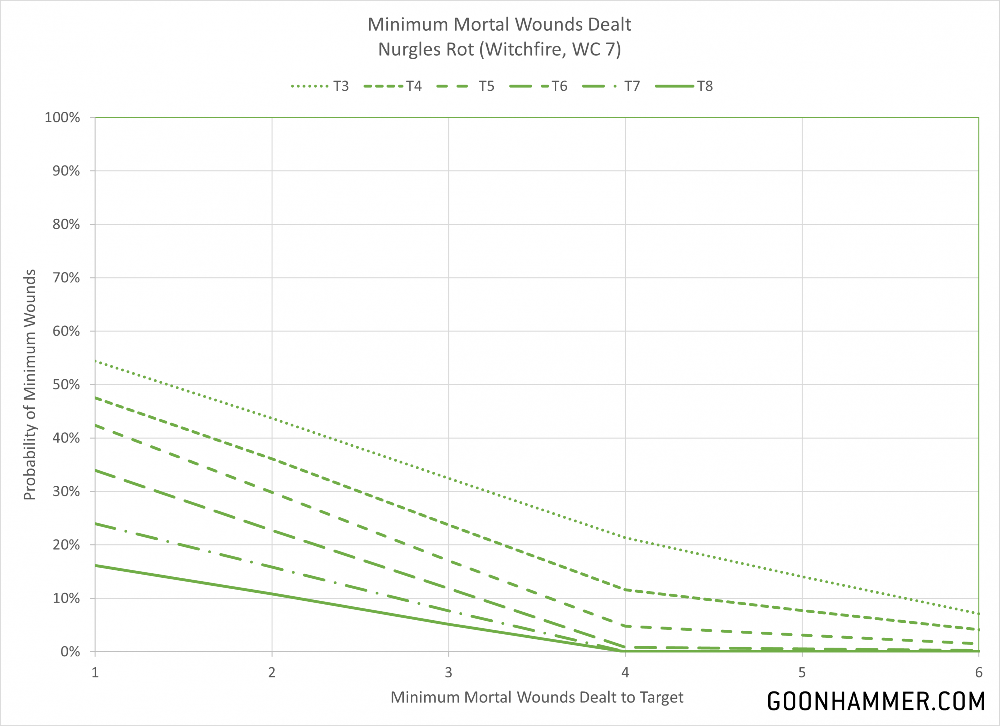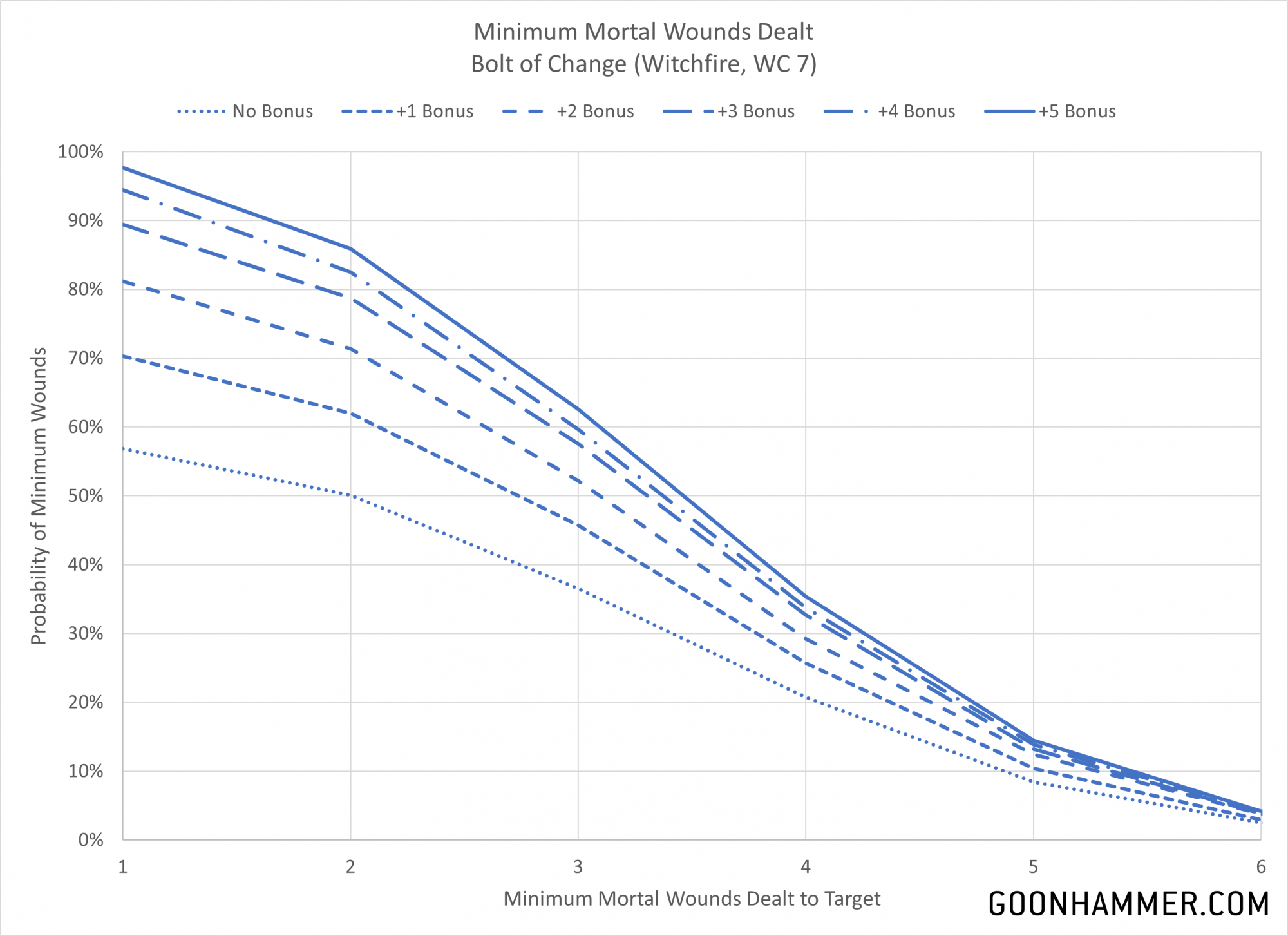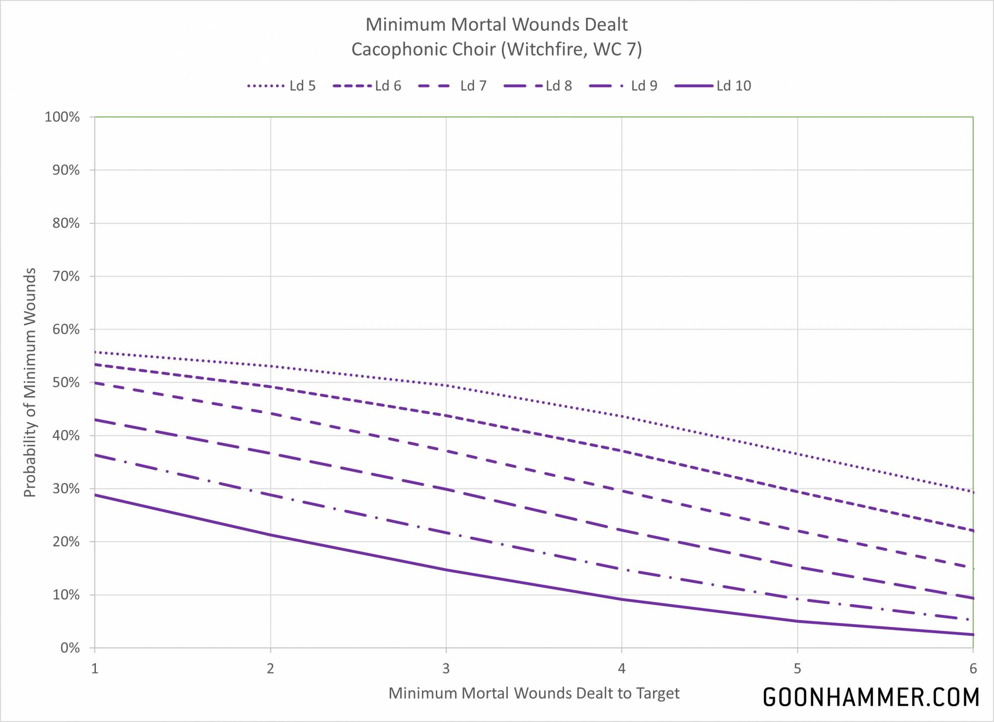 Cacophonic Choir (WC 7) then testing against Ld to inflict mortal wounds, the high warp charge makes this extremely unlikely. Cacophonic Choir serves as a good example. Assuming you get past the warp charge of 7, you roll 3d6 and compare that to the target's Leadership characteristic. Every point that the dice roll exceeds the characteristic is a mortal wound, with a cap of six.
