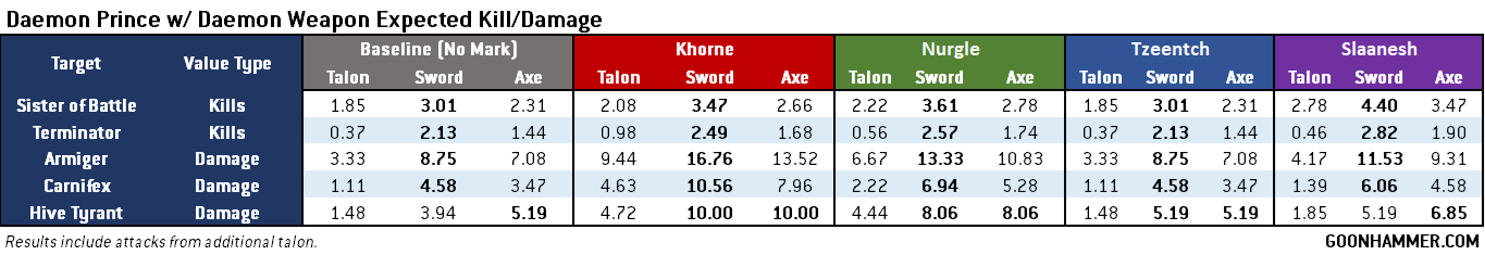 expected damage/kills approach is a good starting point. In brief, expected wounds/damage looks at the average number that an attack will inflict against a particular target. It doesn't take into account variance (which can be considerable), but in general when you're trying to filter out options it's fast and effective. For the purpose of this analysis we'll take a look at a charging Daemon Prince with no bonuses from Legion, Wanton Slaughter, psychic powers, or Stratagems. It's not perfect but with so many variables we have to start somewhere.