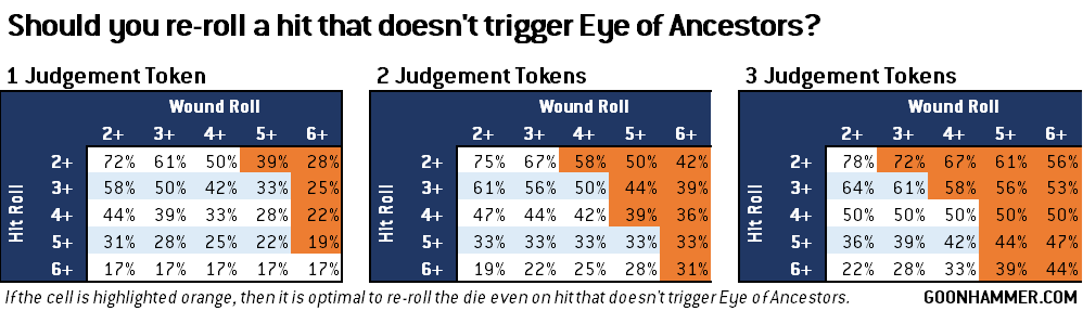Eye of the Ancestors going off and triggering an auto-wound for an attack. The chart below shows the scenarios in which the probability of wounding by re-rolling the hit is greater than the probability of wounding by simply continuing the attack sequence.