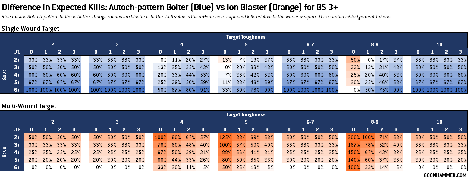 To read the chart below, first decide if the target has a single wound or multiple. Then find the target Toughness and Save characteristics along with the number of Judgement tokens, and look up the corresponding cell. If the value is blue then the Autoch-pattern bolter is the better weapon. If the cell is orange then the ion blaster is optimal. The number in the cell is the percentage difference in the two weapons divided by the expected kills of the inferior weapon.