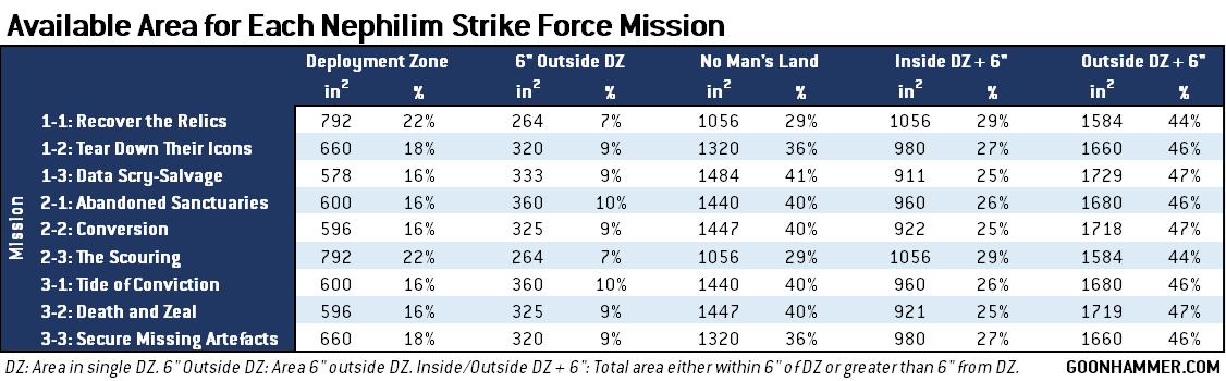 Warrior Pride which requires you to not be in your own deployment zone. The charts below show the available area for the deployment zone, region 6" outside of a single DZ, and No Man's Land. There's also columns for the total available area for the secondary objectives which either require you to be within 6" of a DZ or at least 6" away.