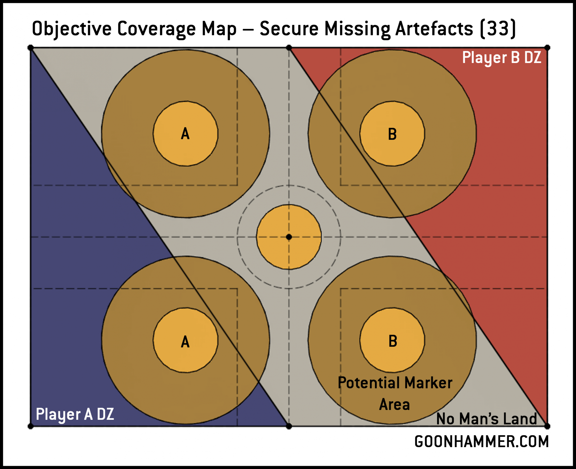 - Secure Missing Artefacts is incredibly dynamic thanks to the ability to shift an objective marker 6" horizontally. It's possible to move all four of the markers such that they can be contested in two zones instead of the zone they're wholly within at the start.