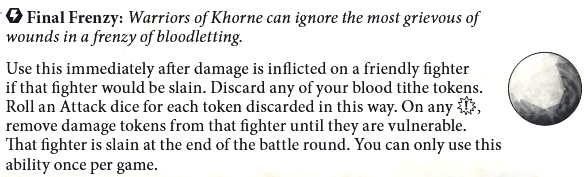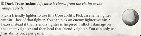 The Crimson Court have a cool ability in Dark Transfusion. It's thematic in that one of your vampires is draining away the life force of an enemy and rejuvenating themselves with it, plus it's also just a solid in-game ability. The damage is guaranteed, as is the healing, as long as your fighter is in position. Being able to have effects like this without relying on a dice roll is always welcome. It does come at the cost of being a core ability so you have to dedicate one of your 12 activations to using it, but it's still one of the stronger abilities on this warscroll. Remember you can use heal effects even when undamaged, so if you really need to get one point of damage onto an enemy you can still fire this off even with uninjured fighters.