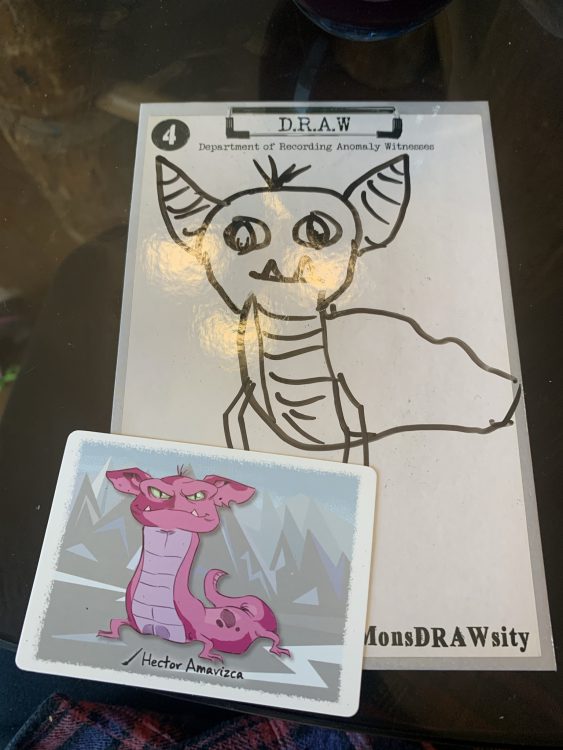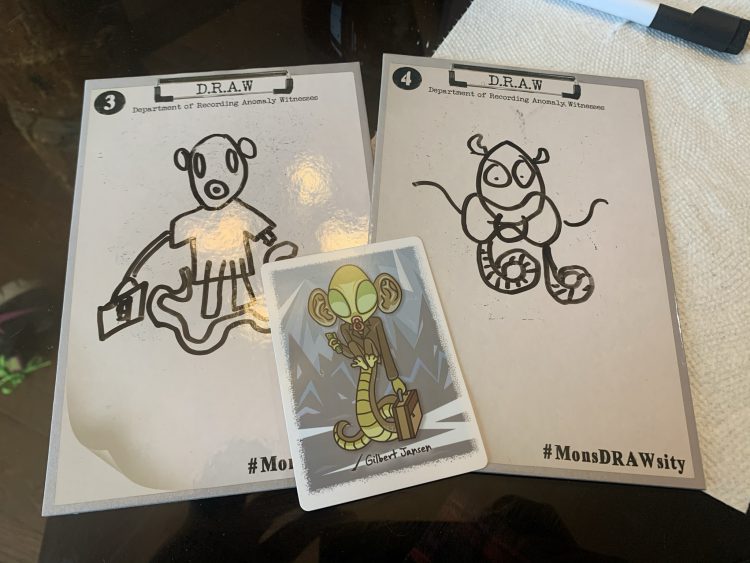 bonkers drawing of a monster before getting 2 minutes to try and describe it to the other players. They've taken on the role of a police sketch artist in a Men In Black style organization called the Department of Recording Anomaly Witnesses (D.R.A.W.) and have to do their best to recreate the monster by listening to the Witness and asking questions. The catch is that the Witness can't look at the Monster Card outside of those 20 seconds; they're on memory alone.