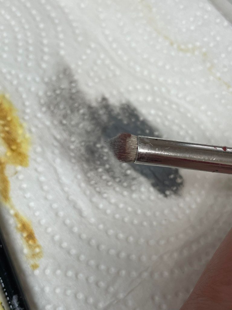 After I basecoat, I apply a black wash and wait for it to dry. Once it dries, it’s drybrush time. I load up my drybrush with Citadel Dawnstone paint, and using a paper towel I brush off the excess paint. I want there to be just a little bit of paint coming off when I’m drybrushing, for the best highlighting effect.