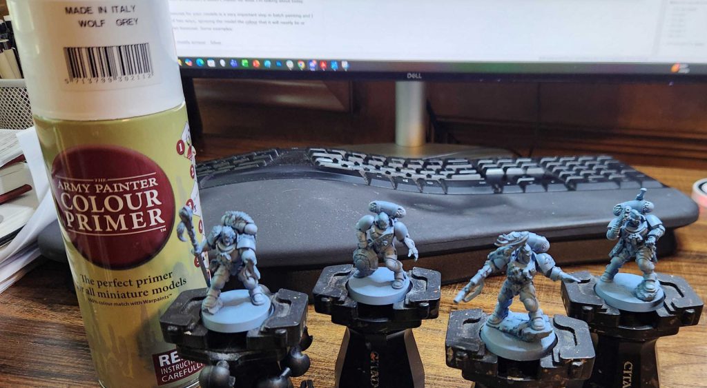 The goal here is to hit each model with the same color, hitting all of the relevant spots as I go along. The time you save batch painting is going to come from two things: