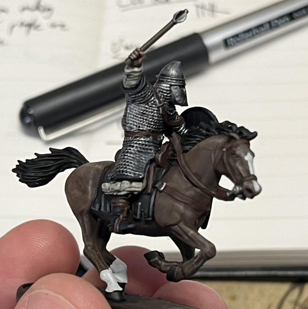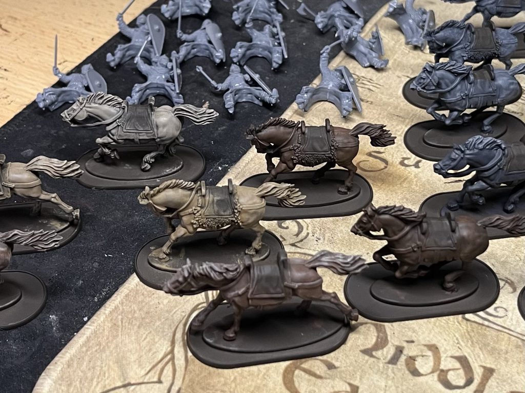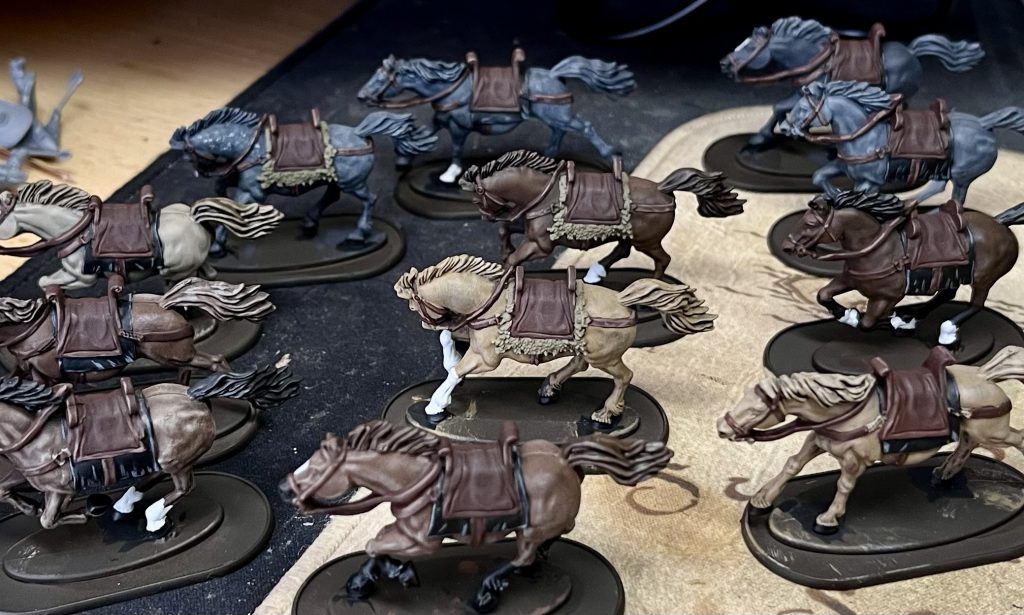 - Brown leathers for the saddles and straps followed by a careful lighter brown drybrush just following the edges