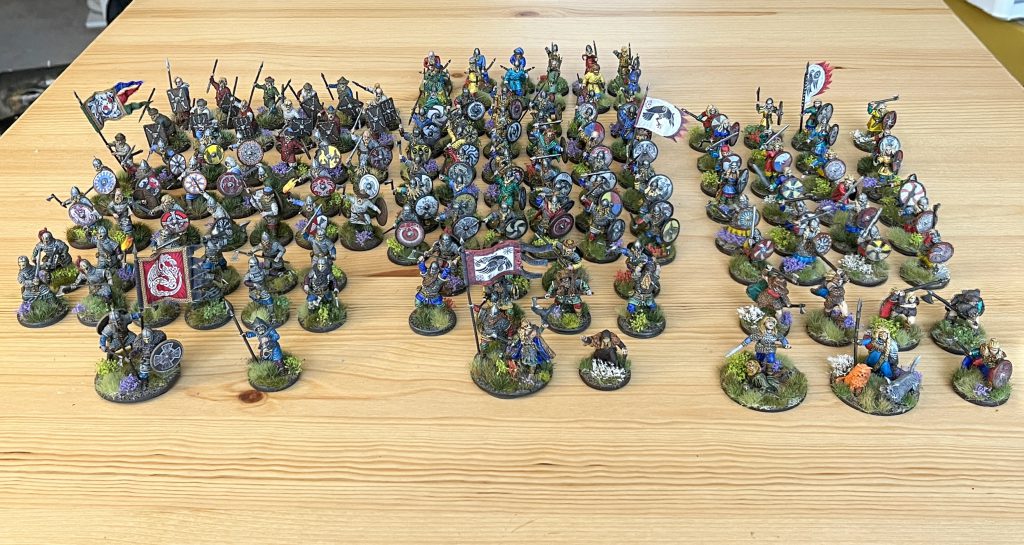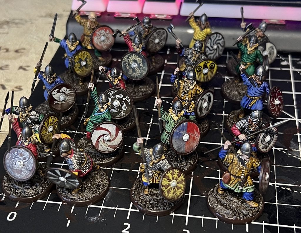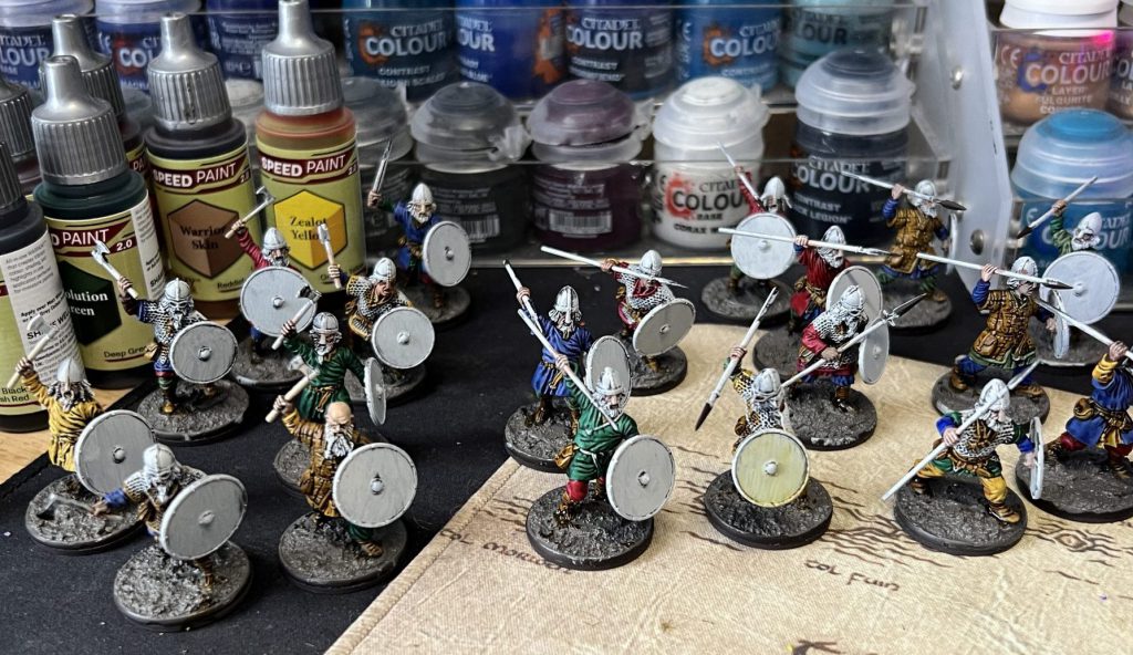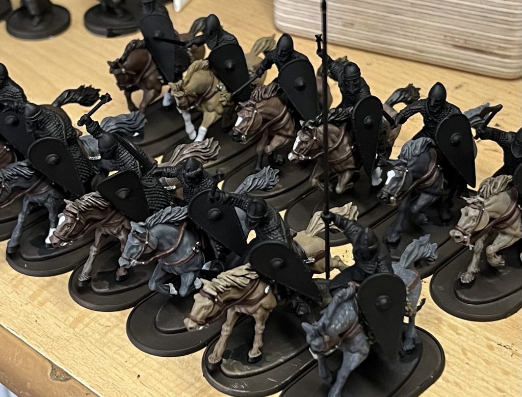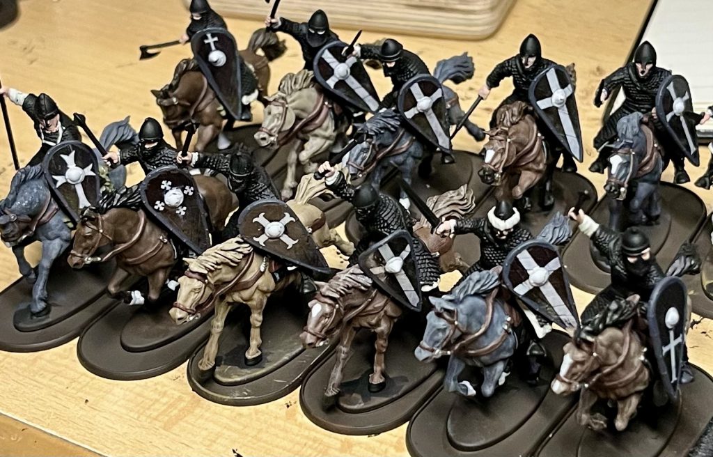 I batch painted these across one evening after work and finished them the next morning before work; I work from home and have a few hours either end of my day when I can sit down for some painting. These are Victrix's Norman Cavalry that I painted and use as a Milites Christi (Knights Hospitaller) Warriors in Saga. They're a great example of both parts here since the horses were painted first, separate from the riders, as they were largely just one colour each before adding on details adding the riders on later.