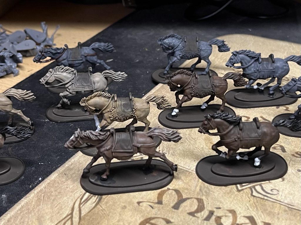 painting horses so I won't reiterate too much of that here. The short of it is I chose a few browns, tans, and greys to paint each horse with a solid basecoat first before drybrushing them with a lighter tone. Some of the greys I decided to be a little fancy with and added dappling by using the same drybrush and stippling it on in parts instead of focusing on raised areas like normal, you can see that on the grey in the top right of the below image.