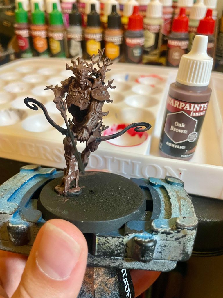 To start drybrushing, we will need a basecoat. For this, I apply a coat of Army Painter’s Oak Brown all over the model.