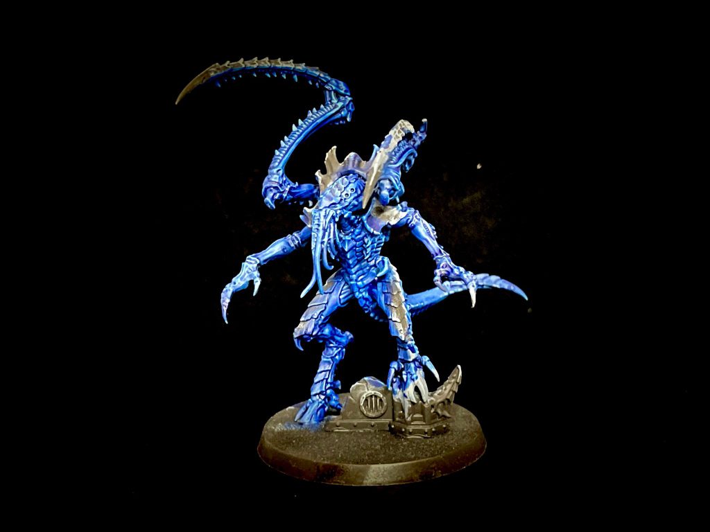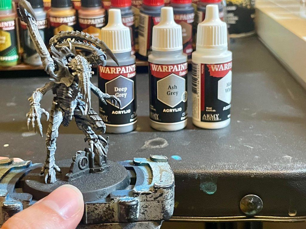 I’m going to paint this guy a deep blue to match the rest of my homebrew hive fleet, Hive Fleet Astro. I’ll be applying some speed paint to him to get that perfect color, and in order to make the highlights really pop I’m going to drybrush some underpants. First, I’ll apply a basecoat of Army Painter Deep Grey all over the model. After this, I’ll drybrush on Ash Grey to add highlights to the model, followed by Matte White. Speed paints are already designed to add natural highlights when applied, but when we underpaint like this it makes those highlights really pop!
