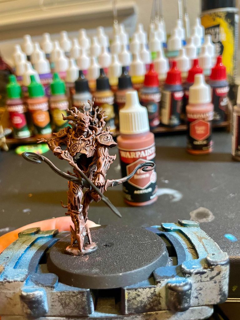 I’m going to use painting the oaken skin of this Kurnoth Hunter from Games Workshop as my example for how to drybrush. This model has lots of raised details for the dry paint from my drybrush to dust on to, and the stereotypical drybrush texture works well for Sylvaneth, who are made of wood.
