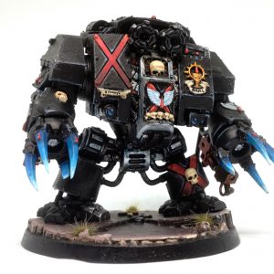 On the left: A Death Company dreadnought painted with satin-finish GW paints, notice how the black on the right shoulder and chestplate are reflecting the light from the lamp (Specular highlights). On the right: An Eldfall Chronicles Slayer Dragoon painted with ultra-matte Scalecolor paints, all the highlights are exactly where I placed them, with no interference from the light-bulbs illuminating the miniature for photographing.
