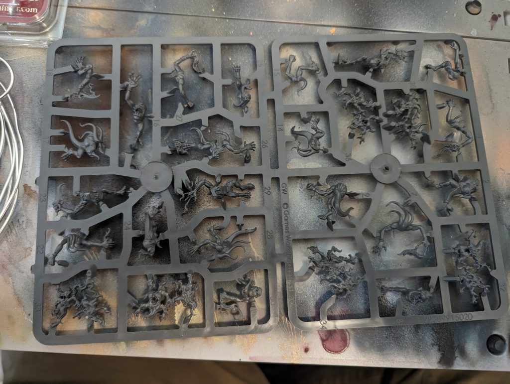 Looking at the sprue there are a lot of great options here. Big bionic claws, weird little arms and even the gun options are all things we’re gonna use. That said there’s not enough here for 10 models so we’re gonna have to find another kit. Luckily someone in my local community had some extra stuff from the Serberys kit which also has some neat stuff. Also blue horrors with guns is hilarious to me so we’re gonna make it happen.