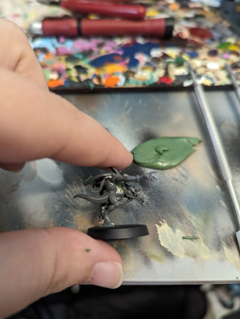 Now you may have noticed I made Way Too Much Greenstuff. So I did some basic sculpting and added a tentacle to fill out the area near the gap to make it look more natural. Tentacles like this are easy, just roll it, attach it to the model, and then smooth out where it joins the model with your sculpting tools. The thing to be careful of is not pressing too hard on the greenstuff with your hands to avoid fingerprints, but honestly if it's not too bad primer will stop it from appearing too much. If you get fingerprints on your greenstuff, you can smooth it out with your sculpting tools.