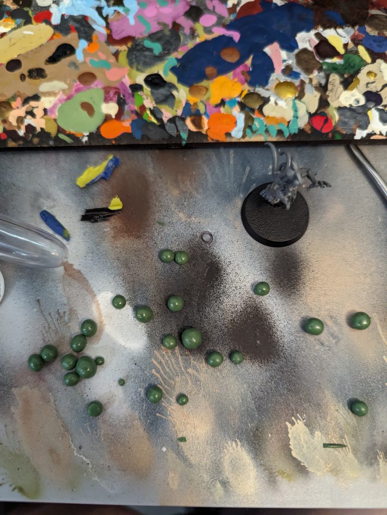 Ok I still have way too much greenstuff. Usually from here I like to make the leftover stuff into things I can use later. I do a lot of chaos coversions, and one thing they always need are eyeballs. so I went about the task of rolling random pieces of greenstuff into spheres that I can throw into a drawer when its done curing and promptly forget about.