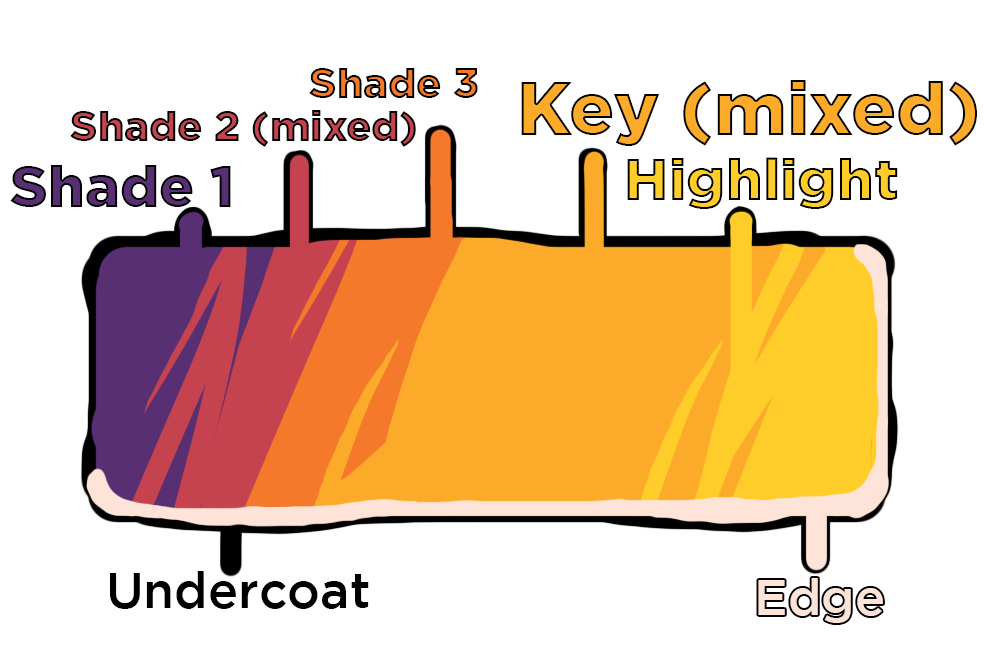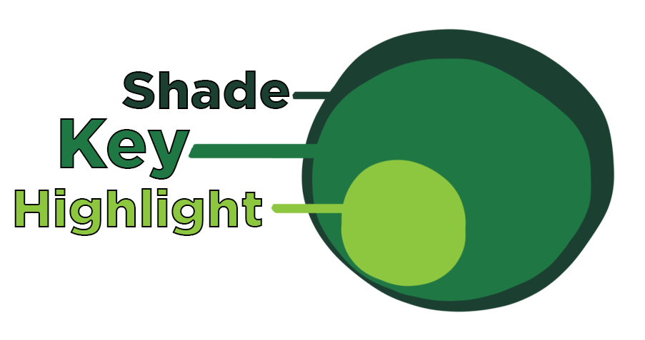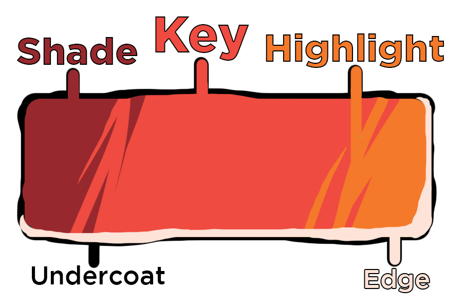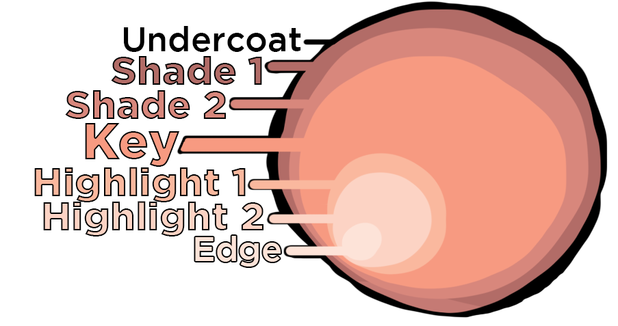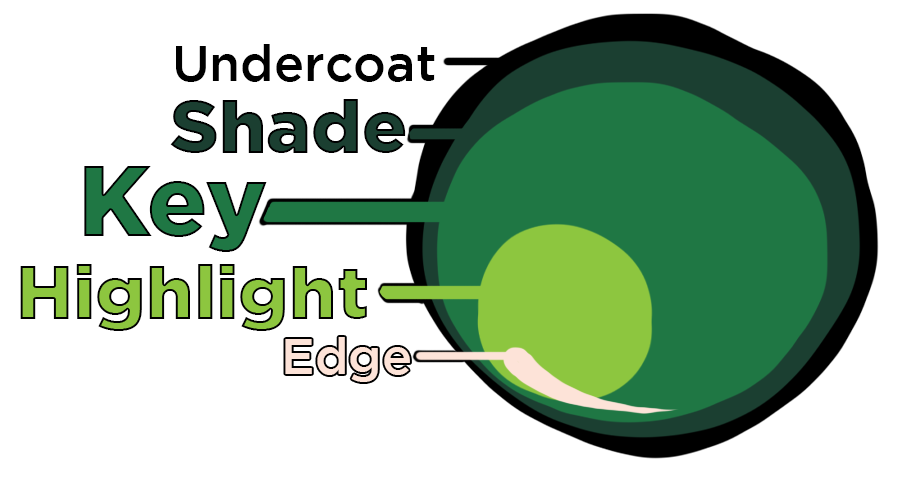 This is not formal terminology, its just how I have personally come to think of it. Layers are applied in order of dark to light. So shades first, then the key, then highlights. If you're a bit confused, don't worry, we got plenty of diagrams and examples coming up.