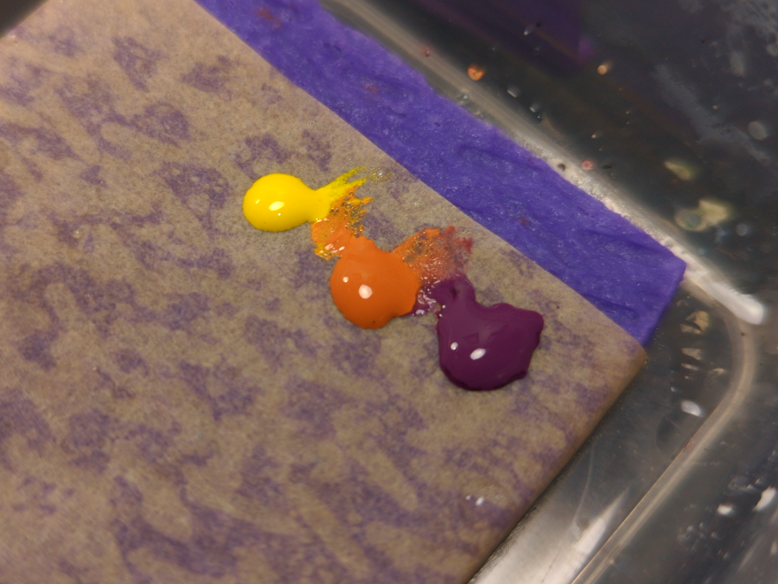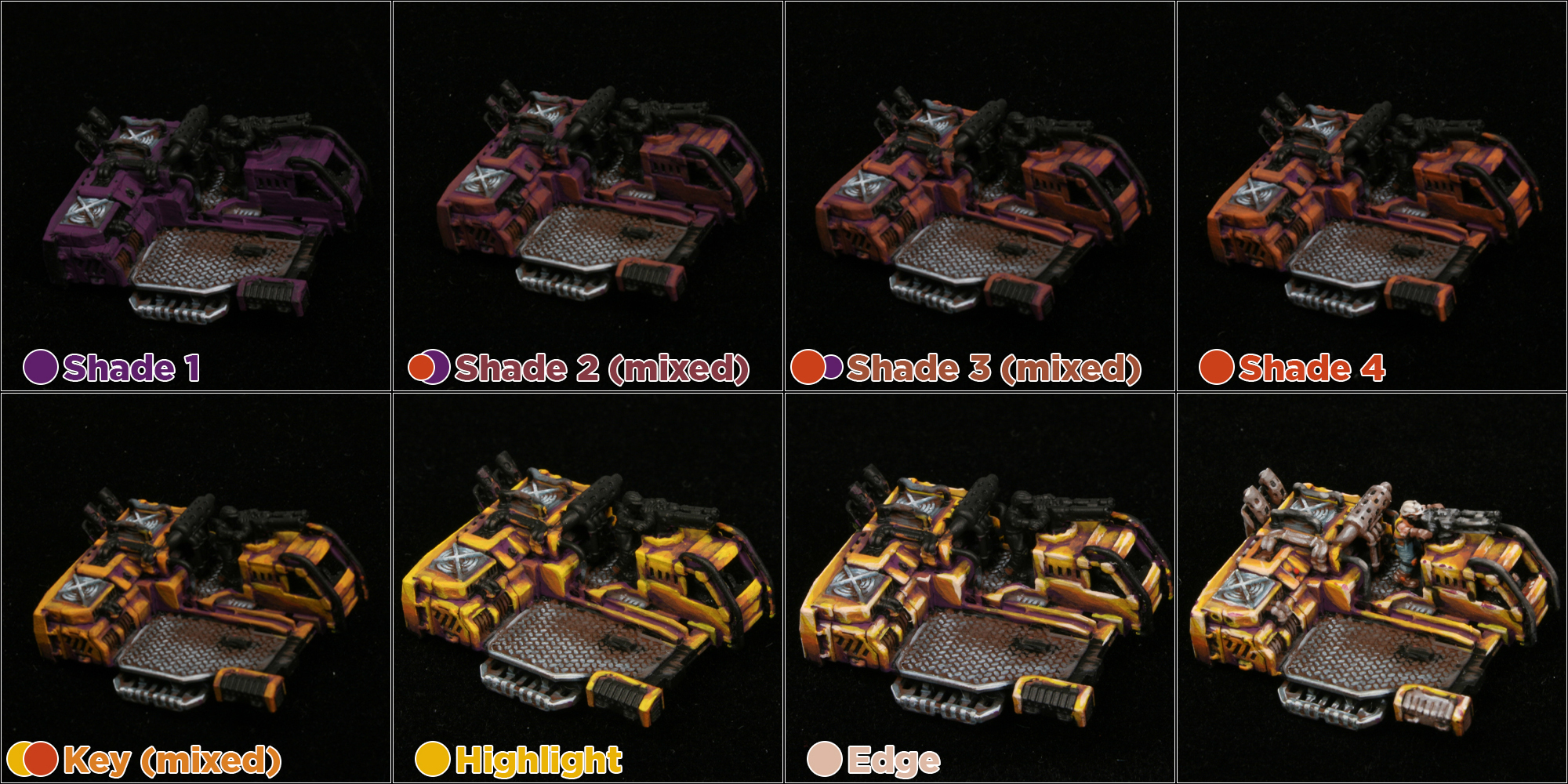 The shift from purple to yellow is a drastic one, so we end up with more shade layers than highlights. Also note that in this case, the key layer is mixed from a shade and the highlight rather than coming straight from a paint bottle.