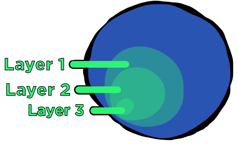 - Shades: These layers come first and are for shadows. Each shade layer gets mostly (but not entirely) covered up by the layer above it, and provide a foundation for subsequent layers. You can have many shade layers.