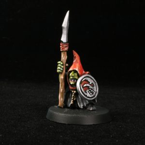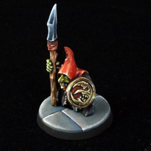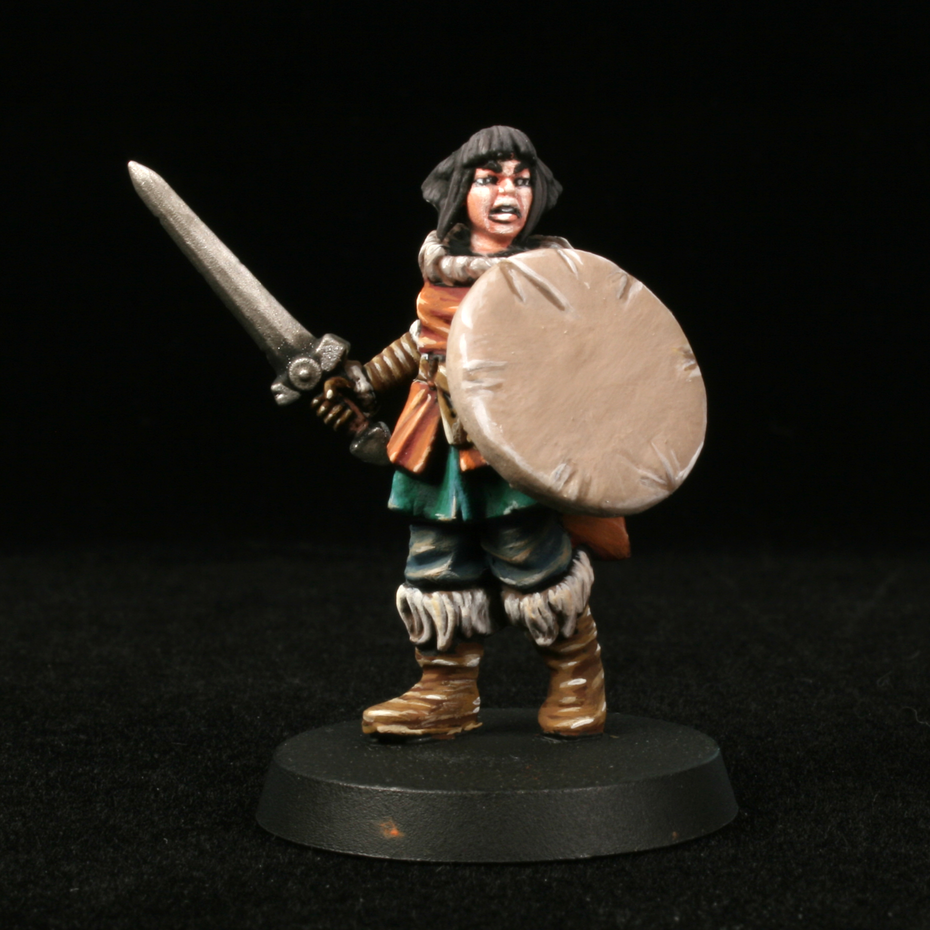 Finish up by picking out the spear's wooden haft, lips, teeth and belt. Unfortunately, our layering toolbox is not yet equipped to deal with the flat, metallic surfaces of the spear head and shield, so for now I just use some silver metallic paint. We'll come back to this with some new techniques later in the article, but this is a perfectly fine place to consider this miniature finished.