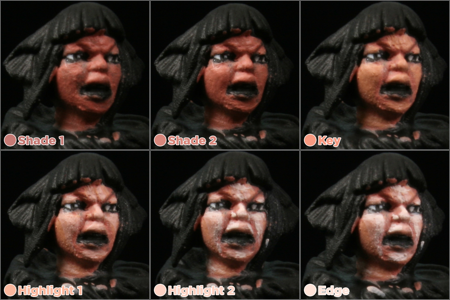 Sometimes three layers just don't blend well enough. We can get smoother transitions by adding more shade and highlight layers (remember there's only one key layer). The easiest way to add more layers is with more paint bottles. One bottle to one layer.