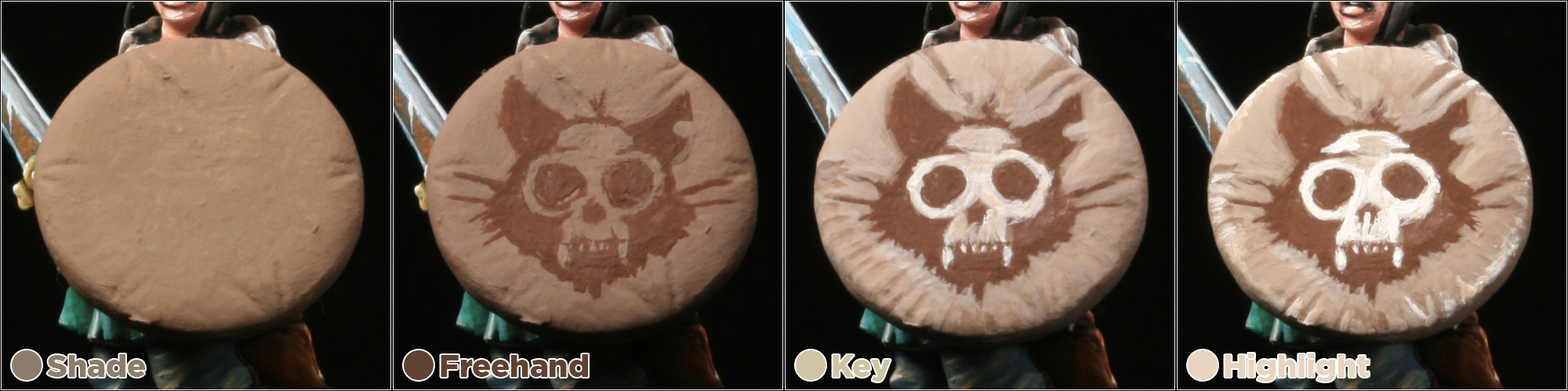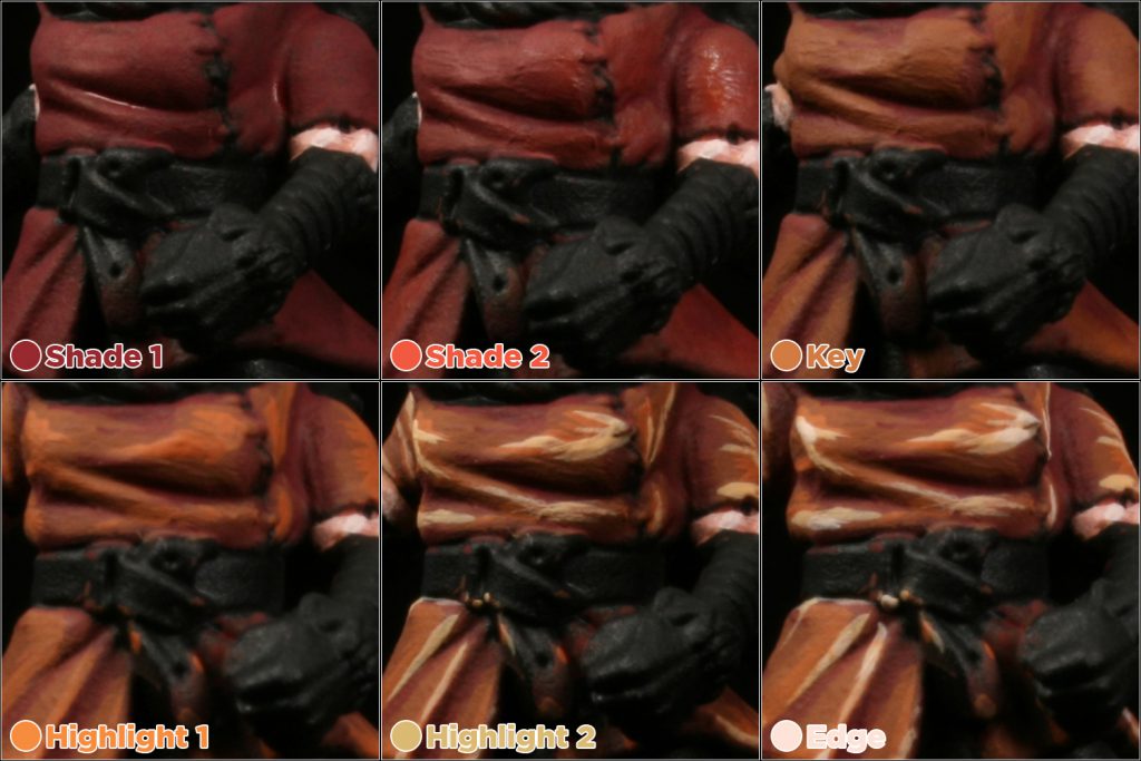 But wait! What about our undercoat or primer? Our undercoat can participate as a layer if it's darker than the darkest shade. This is one reason why I (almost) always prime my miniatures black. By leaving the undercoat exposed between different areas, you get a free "blacklining" effect. This added contrast can really give your colors more visual punch.