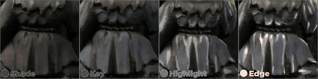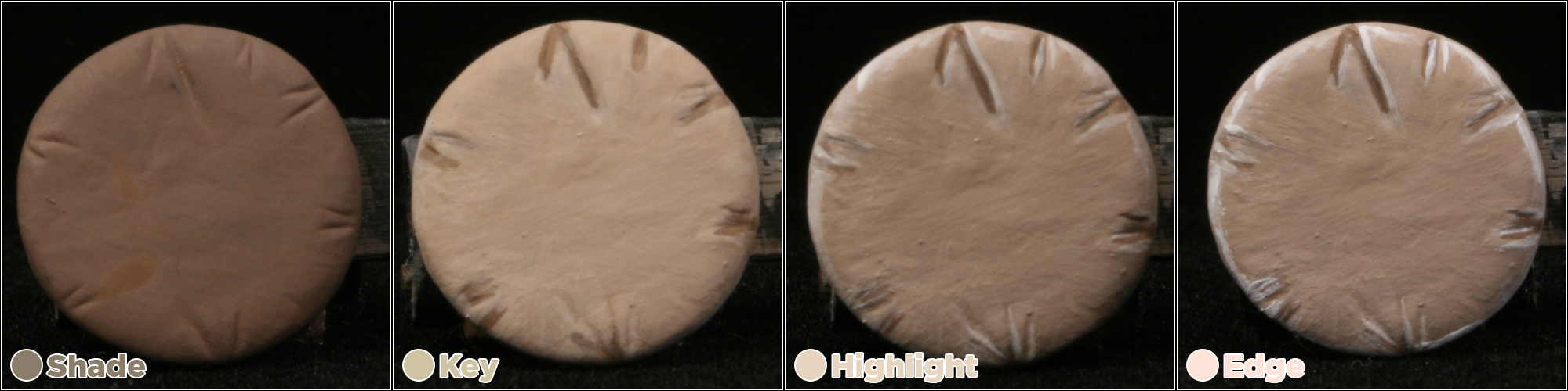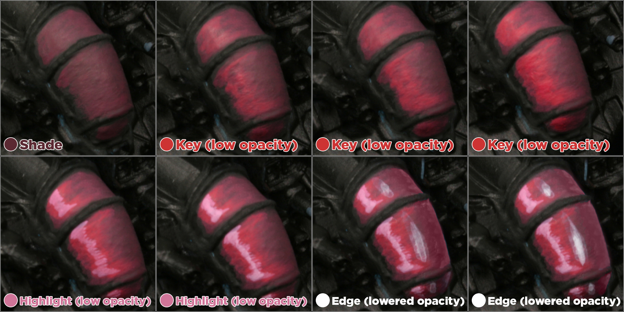 And what about edge highlighting or specular highlights? These are optional and usually done with white or an off-white. Edge highlights often cuts across many layers and is intended to emphasize a shape. Let's take them into account.