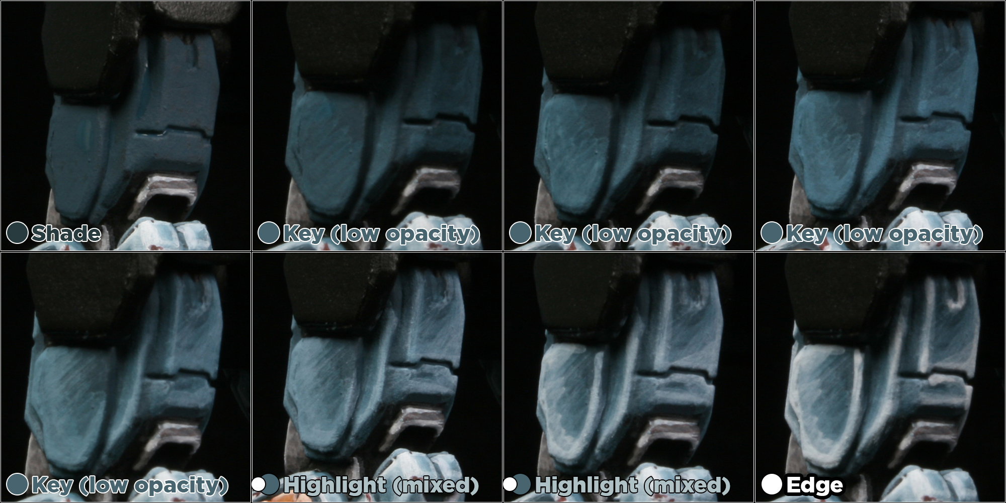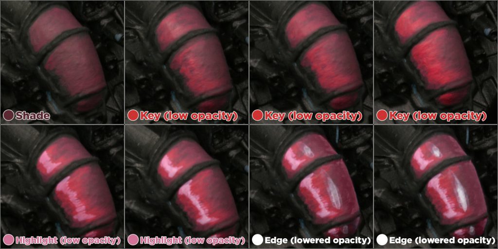 Importantly, layering with reduced opacity lets you increase the number of layers without adding more paint bottles or mixing new colors. With patience, you can use this to get some extremely smooth blending. Its also useful for special effects, like making gleaming cockpit glass and glowing lasers.