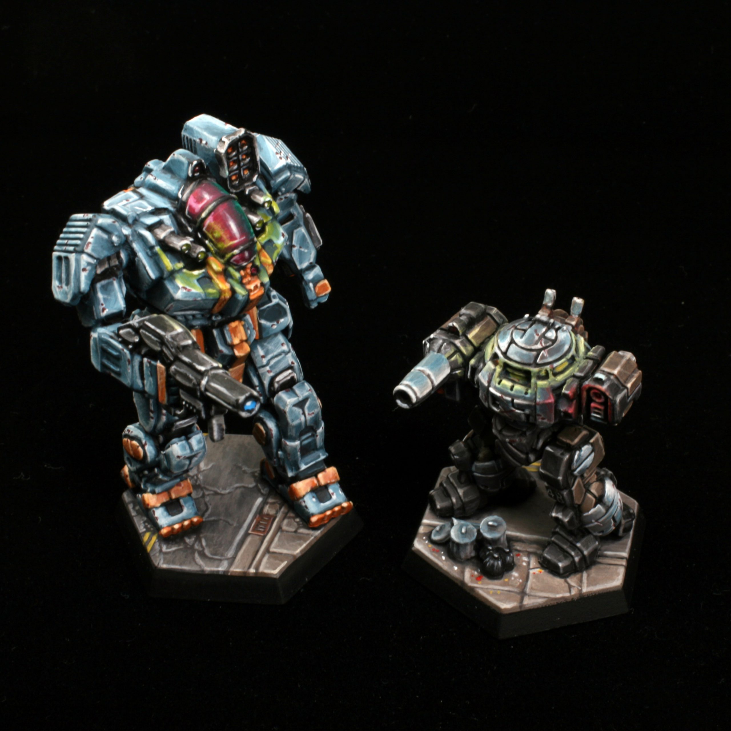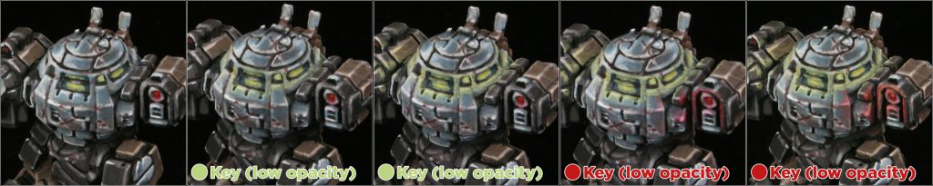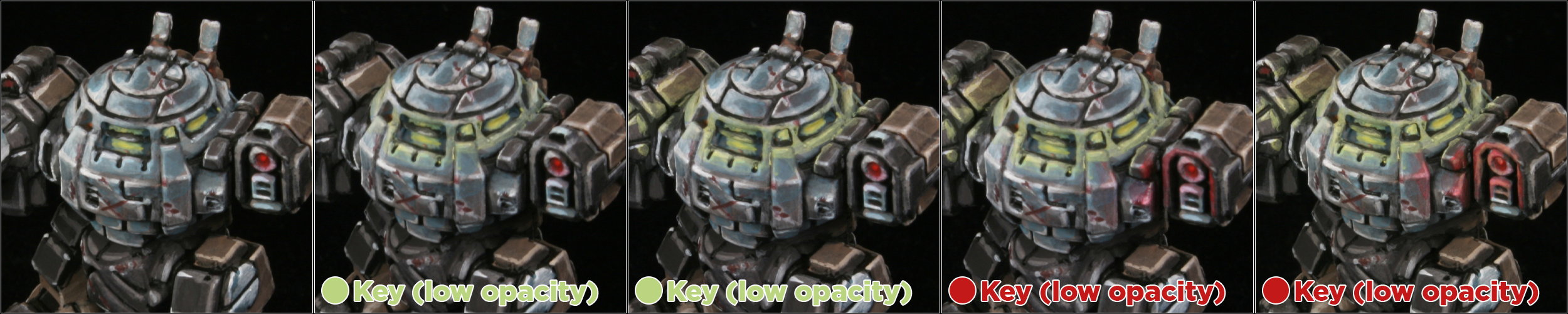 By layering with reducing opacity, we can get alot of mileage out of a single paint bottle. The glow effects only use one paint each, and the blue paneling on both mechs is done with a mere three paint bottles.