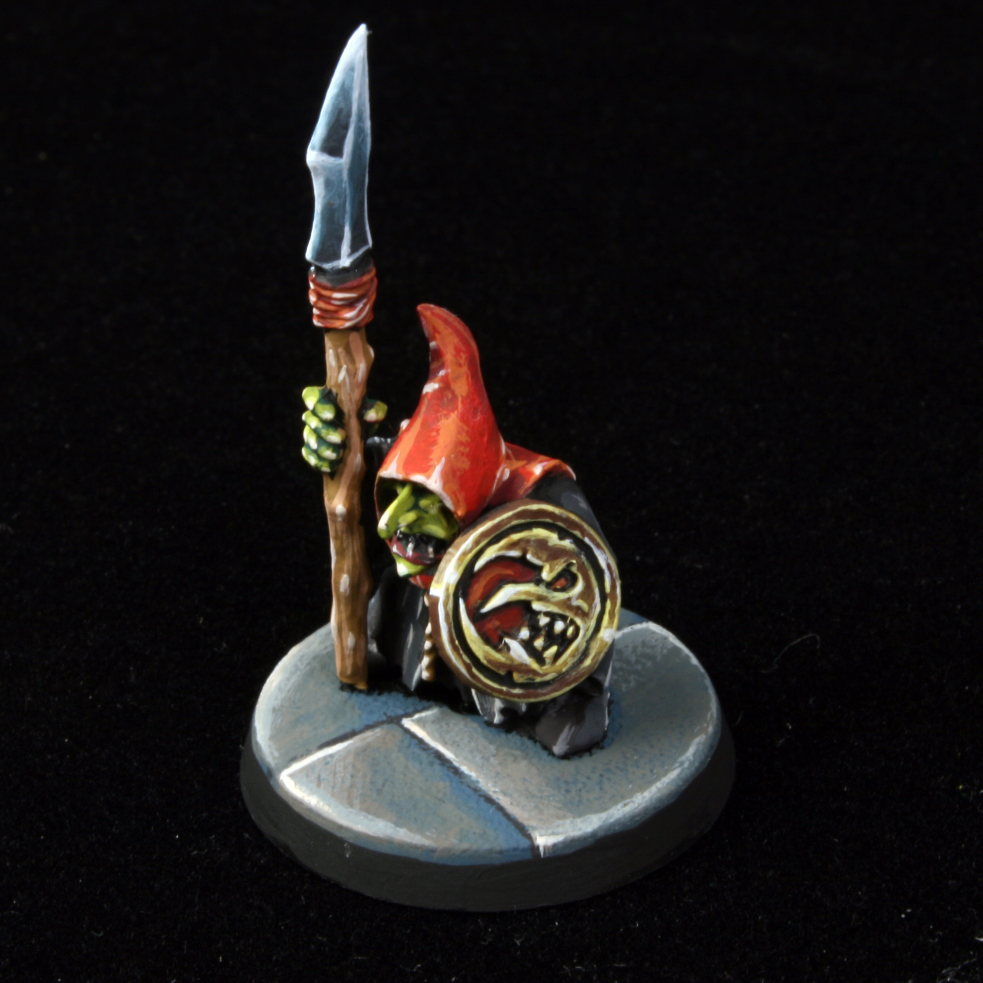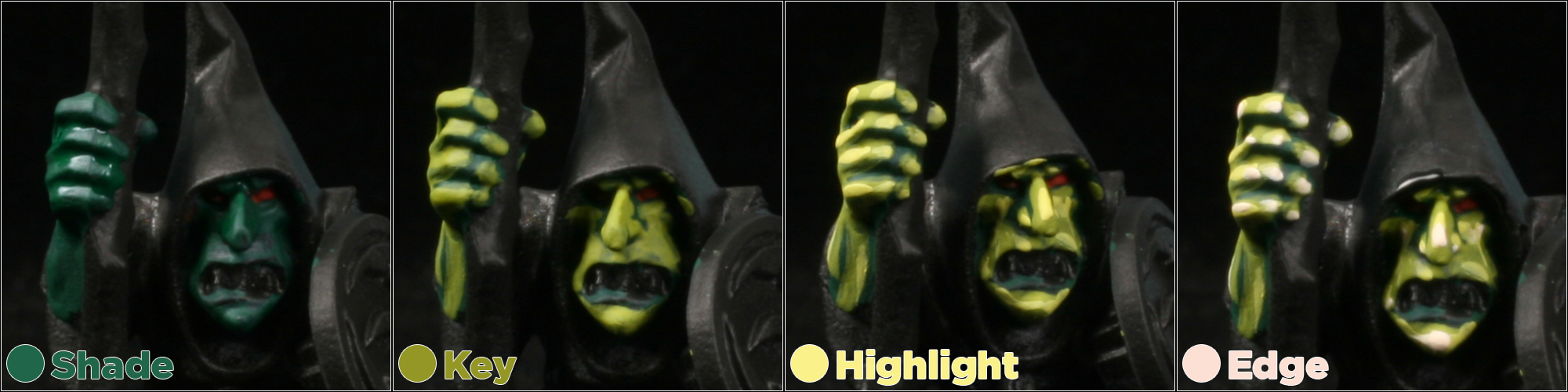 Let's paint a classic goblin using the three layer system. Start by priming black. If you're painting the eyes, do that before you do anything else. Then we add our shade layer. Next comes the key, mostly covering the shade. Next comes the highlight layer, just on the most raised areas. Finally, we add some final edge highlights of very light pink on the knuckles, nostrils. tip of the of the nose, etc.