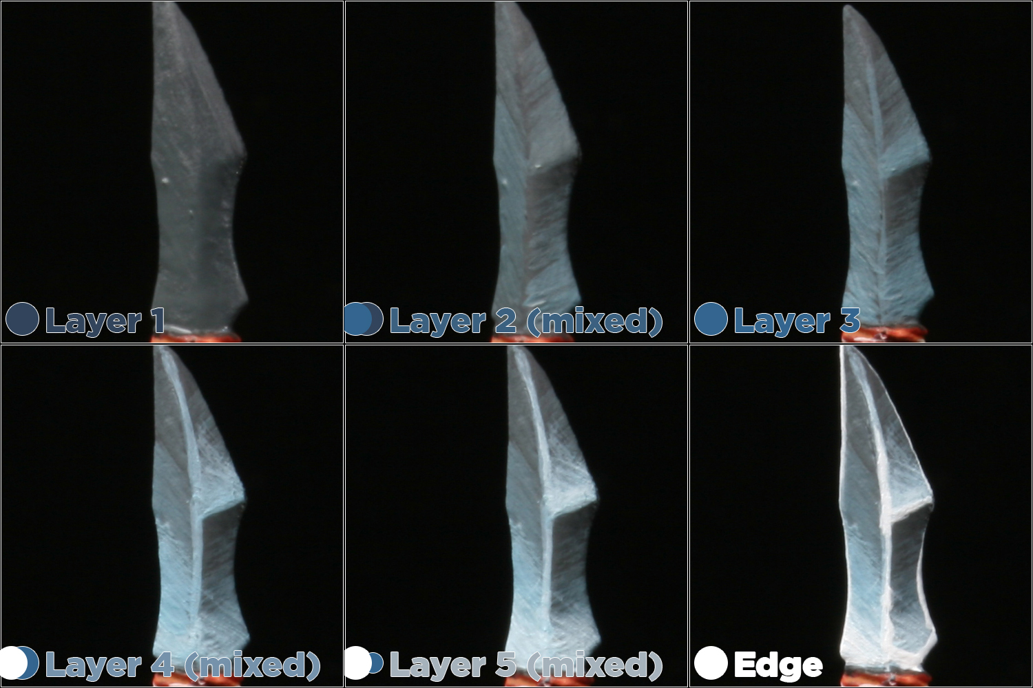 In this example, we start with a gray and layer up to a medium saturation blue. Then layer up to a light gray blue, finishing with a pure white edge