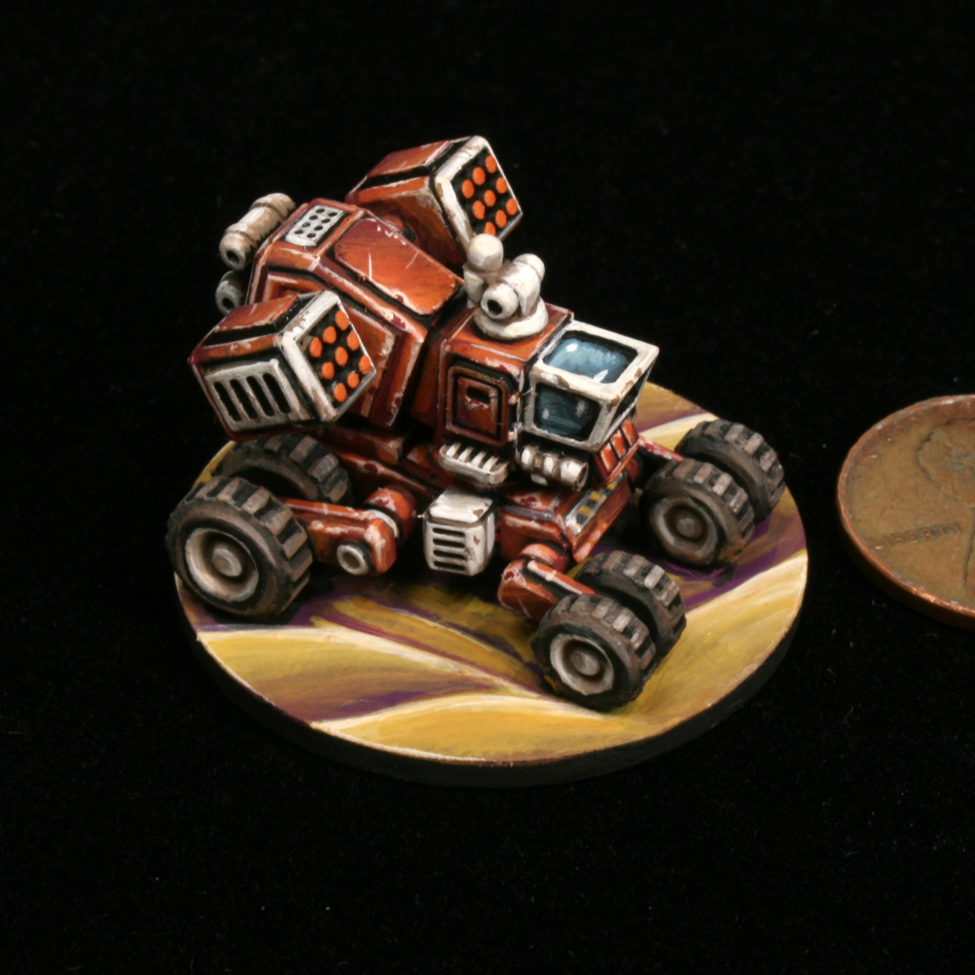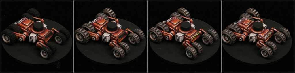 The top half of this vehicle is painted the same way as the bottom. I attach the halves with a tiny amount of blue tack so that the top can swivel. Neato!