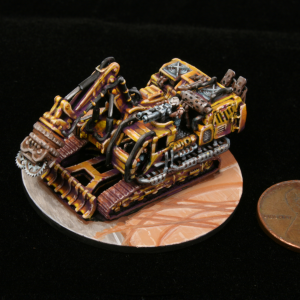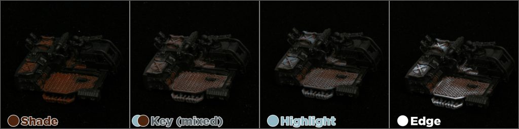 The goblin and barbarian miniatures have lots of organic contours to inform us how to shape our layers. The lighter layers occupy higher topography. We get the layers' shapes "for free" from the sculpt. But now lets tackle a model which is mostly flat surfaces, a common situation for vehicles, buildings and weapons. Its up to us to imagine meaningful shapes to our layers.