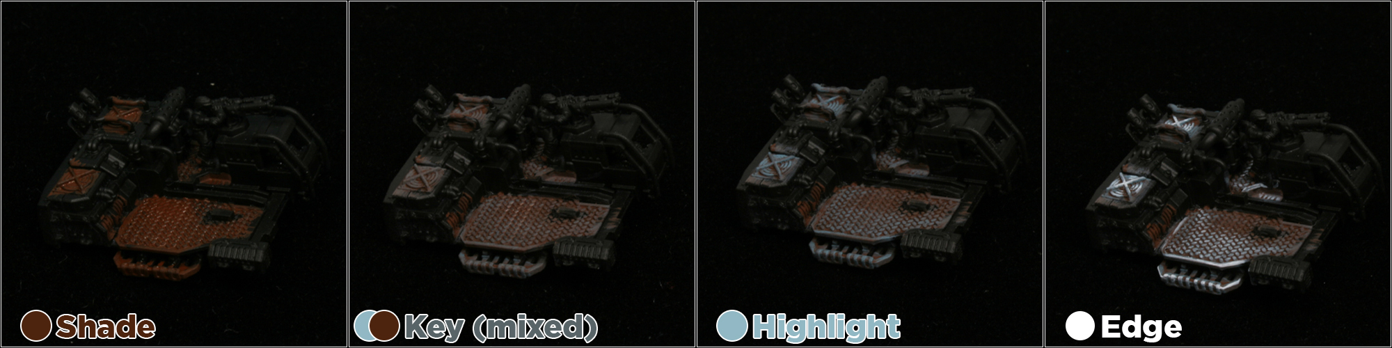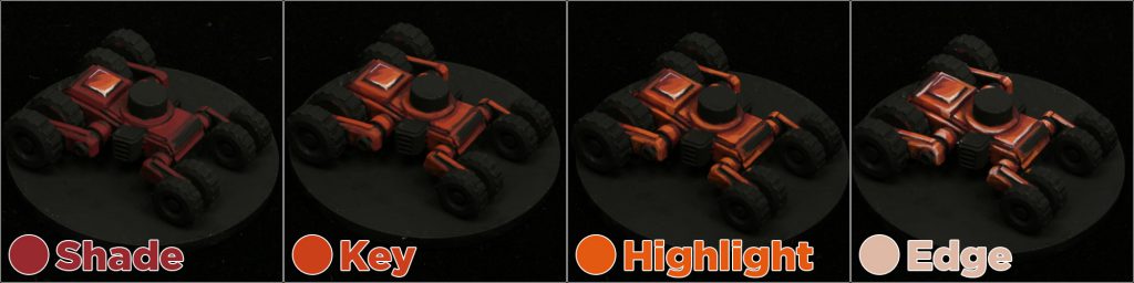 I consider three layers (a shade, the key, and a highlight) to be minimum viable product, and it works well for most 28mm miniatures. Start with the shade. Once it's dry, we cover it mostly with the key, leaving the shade visible in the recesses of the miniature. After the key is dry, we'll put a smaller highlight layer on top in the raised areas. These highlight layers are usually discontiguous, like a little archipelago of paint.